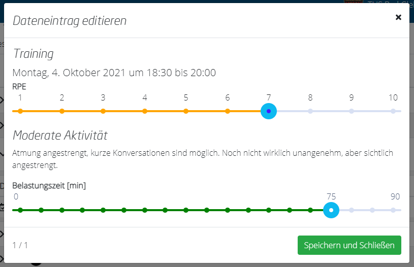 Du kannst jetzt sofort eingeben, wie anstrengt für dich das Training/ Spiel war. (von 0: keine Anstrengung bis 10: maximale Anstrengung).