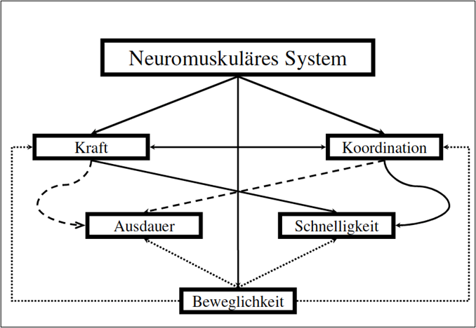 Nach Schmidtbleicher (1994, S. 129) darf die Schnelligkeit nicht als eigenständige motorische Fähigkeit angesehen werden. Auch Grosser (1992, S. 394) hat angemerkt, dass die Schnelligkeit nicht als einzelne „Eigenschaft“ auftritt und durch die schematische Darstellung (Abbildung 1) nach Wirth (2021) wird klar, dass zur Ausprägung der Schnelligkeit das Neuromuskuläre System, die Kraft, die Koordination und die Beweglichkeit (mit)verantwortlich sind.