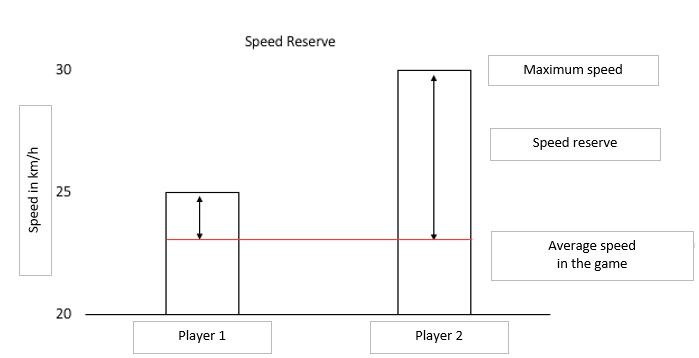 If, for example, the game Average speed of 22 km/h, and we have 2 players (players 1 Top Speed = 25 km/h & players 2 Top Speed = 30 km/h). Which of the two will find the submaximum average game speed for less exhausting? For this reason, the faster player can perform the submaximum performance more often (aka. Repeated Sprint Ability)